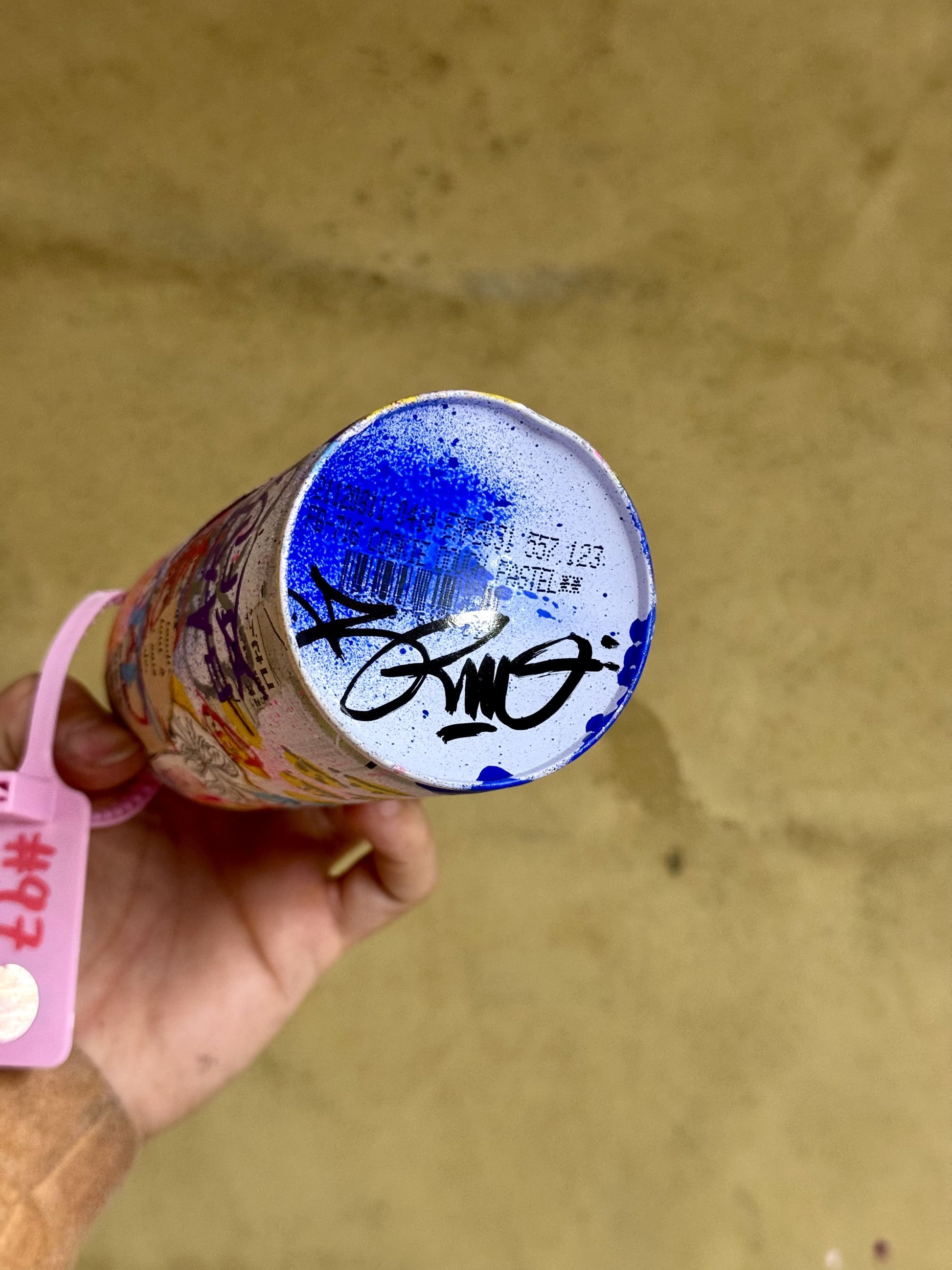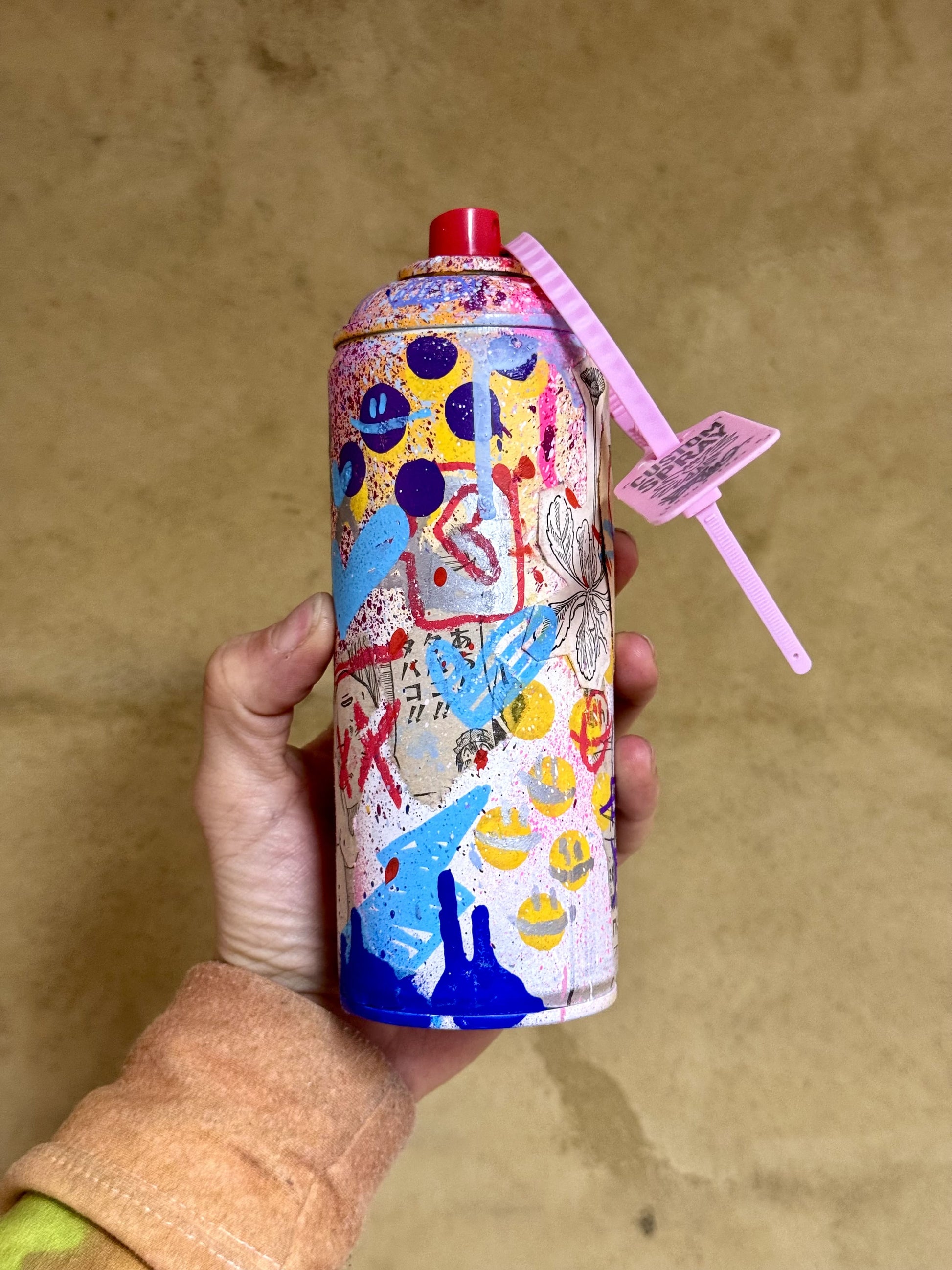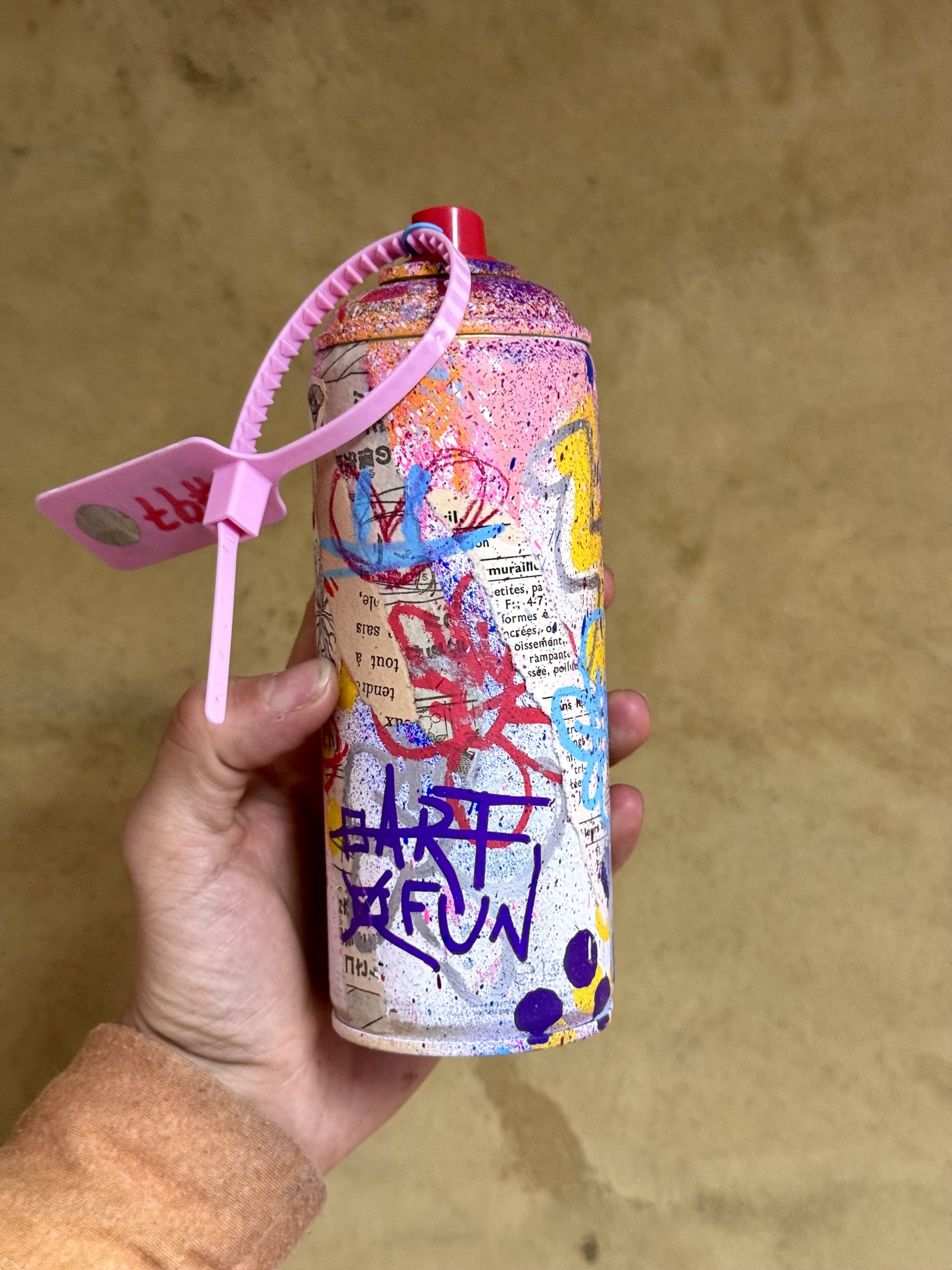 Bombe de peinture vide recyclée et custom en collaboration avec l'artiste TutoDraw. Signée à la main sur la spray avec une preuve d'authenticité sur une carte signée à la main fixée sur la buse en plastique sur le dessus.