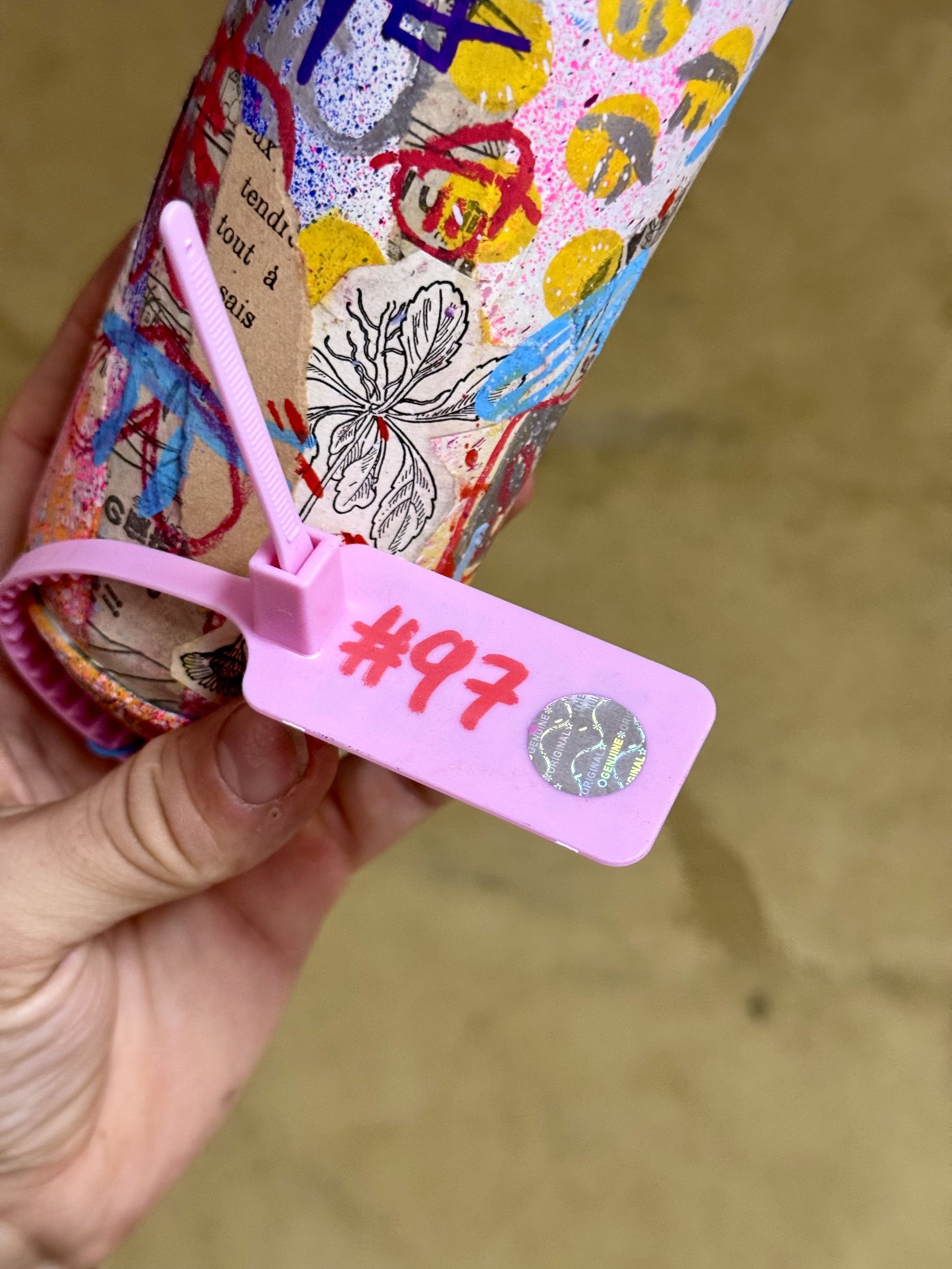 Chacune sont livrée avec une caps (embout en plastique sur le dessus) recyclé également (car souvent bouchée) sur laquelle est fixé un zip rose faisant office de preuve d'authenticité. Le zip est personnalisé sur le devant et signé sur le dos avec un autocollant holographique.