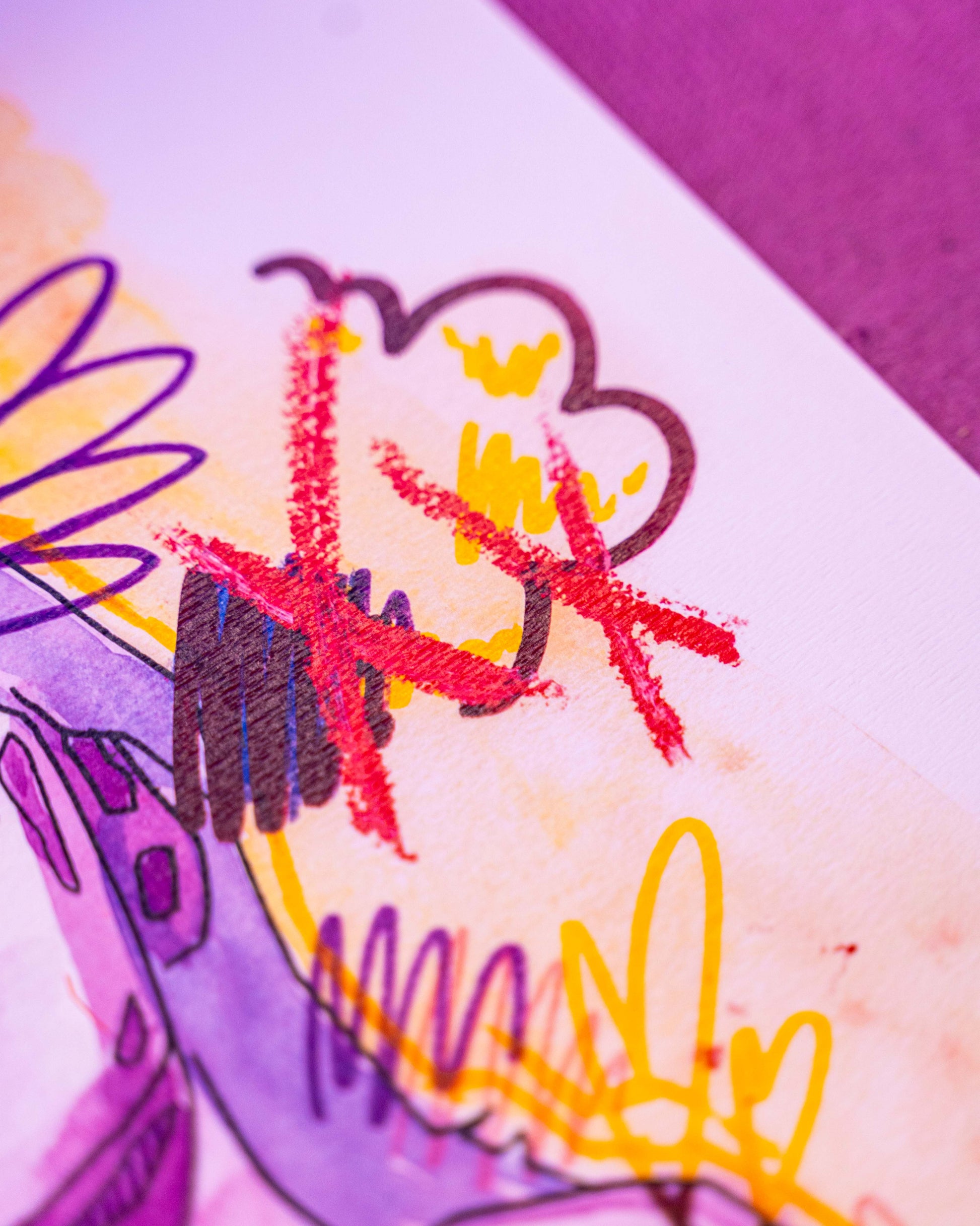 Le dessin a été réalisé en live sur Twitch avec des crayons de couleurs, de la peinture aquarelle, des marqueurs à peinture, des feutres pour enfants et des pastels à l'huile.