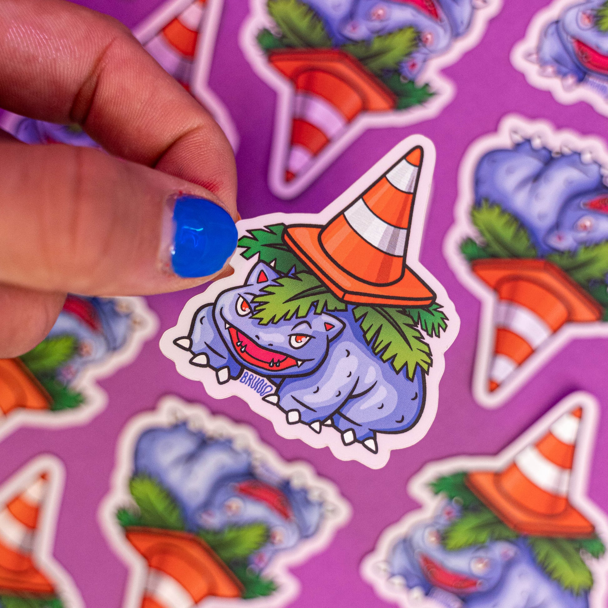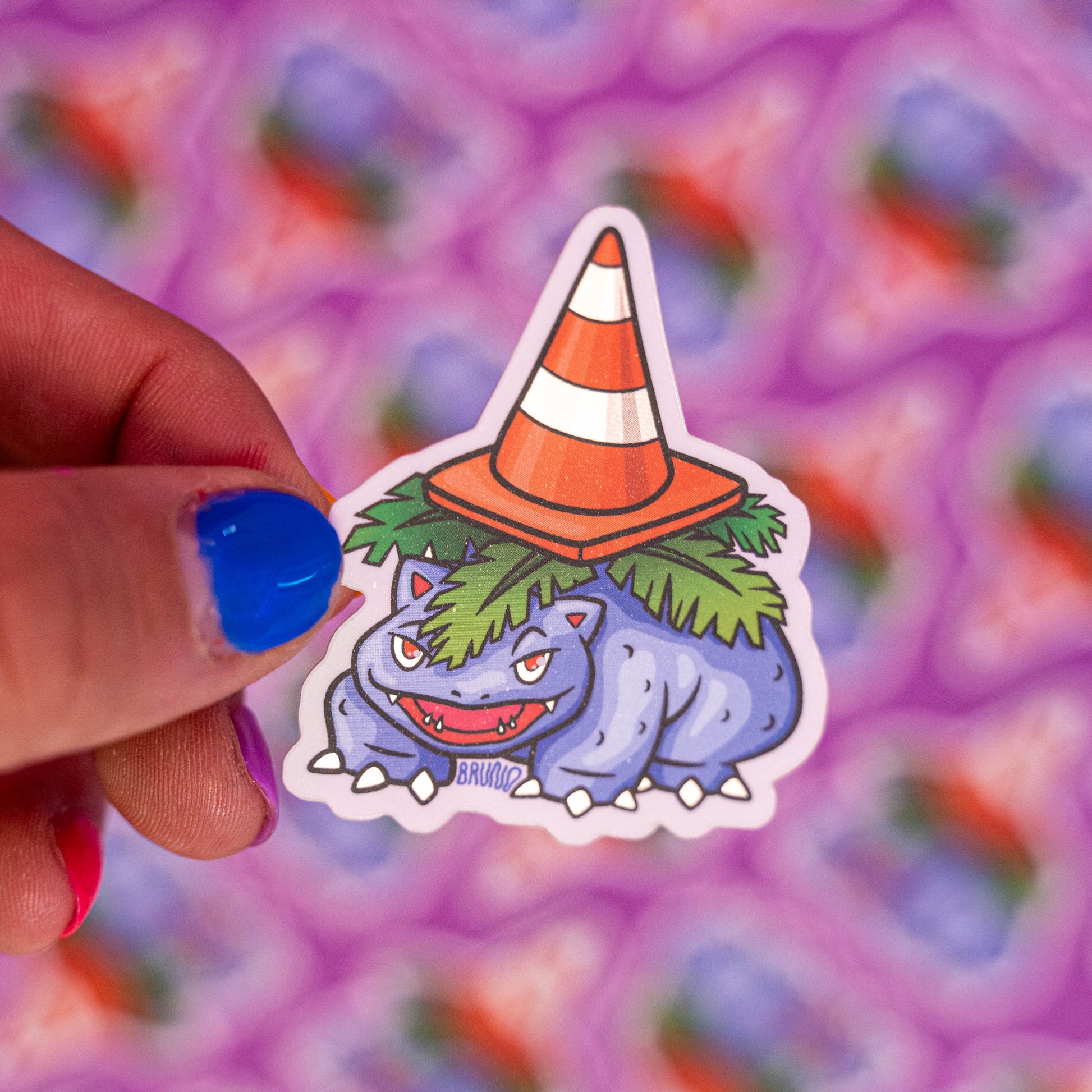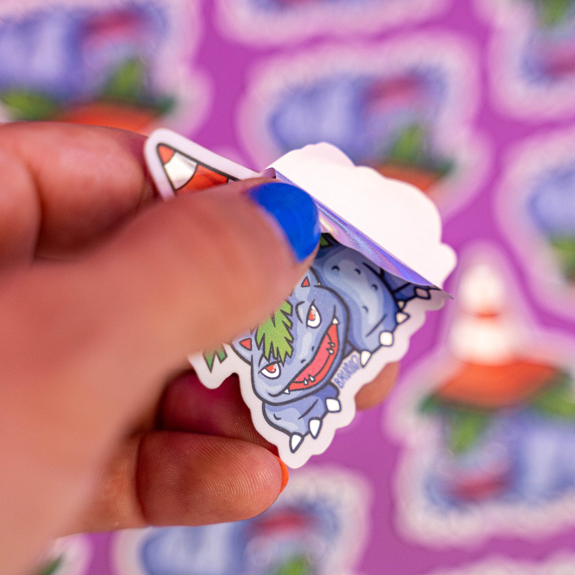Illustration digitale d'une parodie de pokémon imprimée sur sticker Vinyl brillant avec effet holographique.