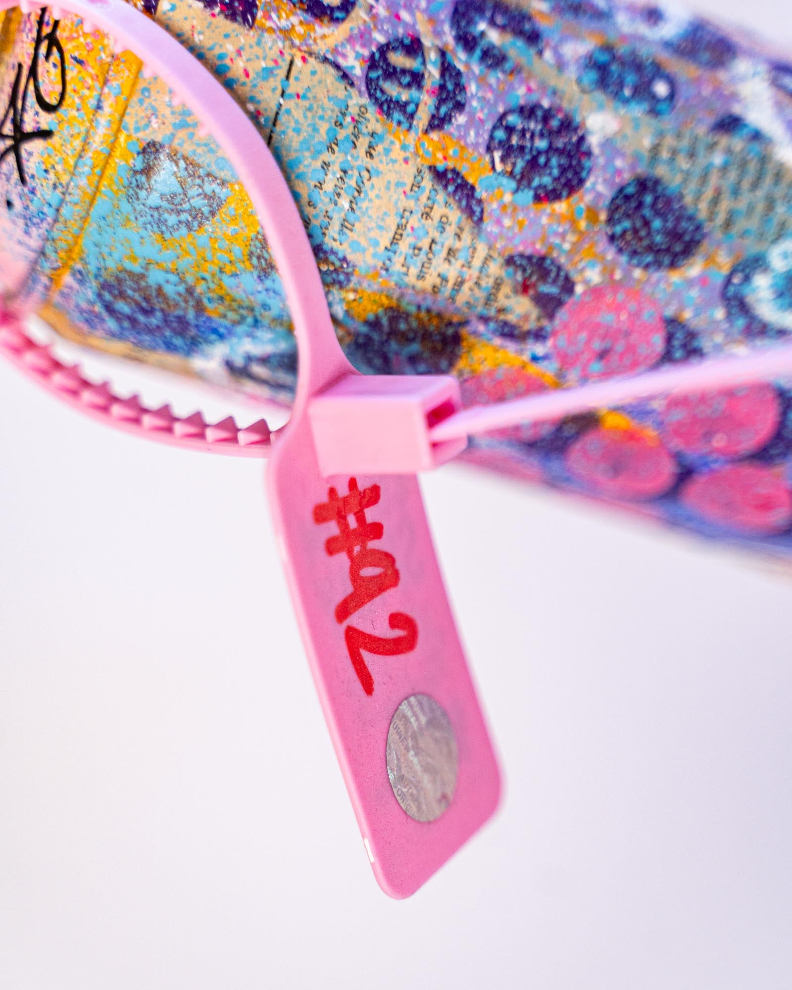 Bombe de peinture vide recyclée et custom. Signée à la main sur la spray avec une preuve d'authenticité sur un Zip Tie rose numéroté à la main fixé sur la buse en plastique.
