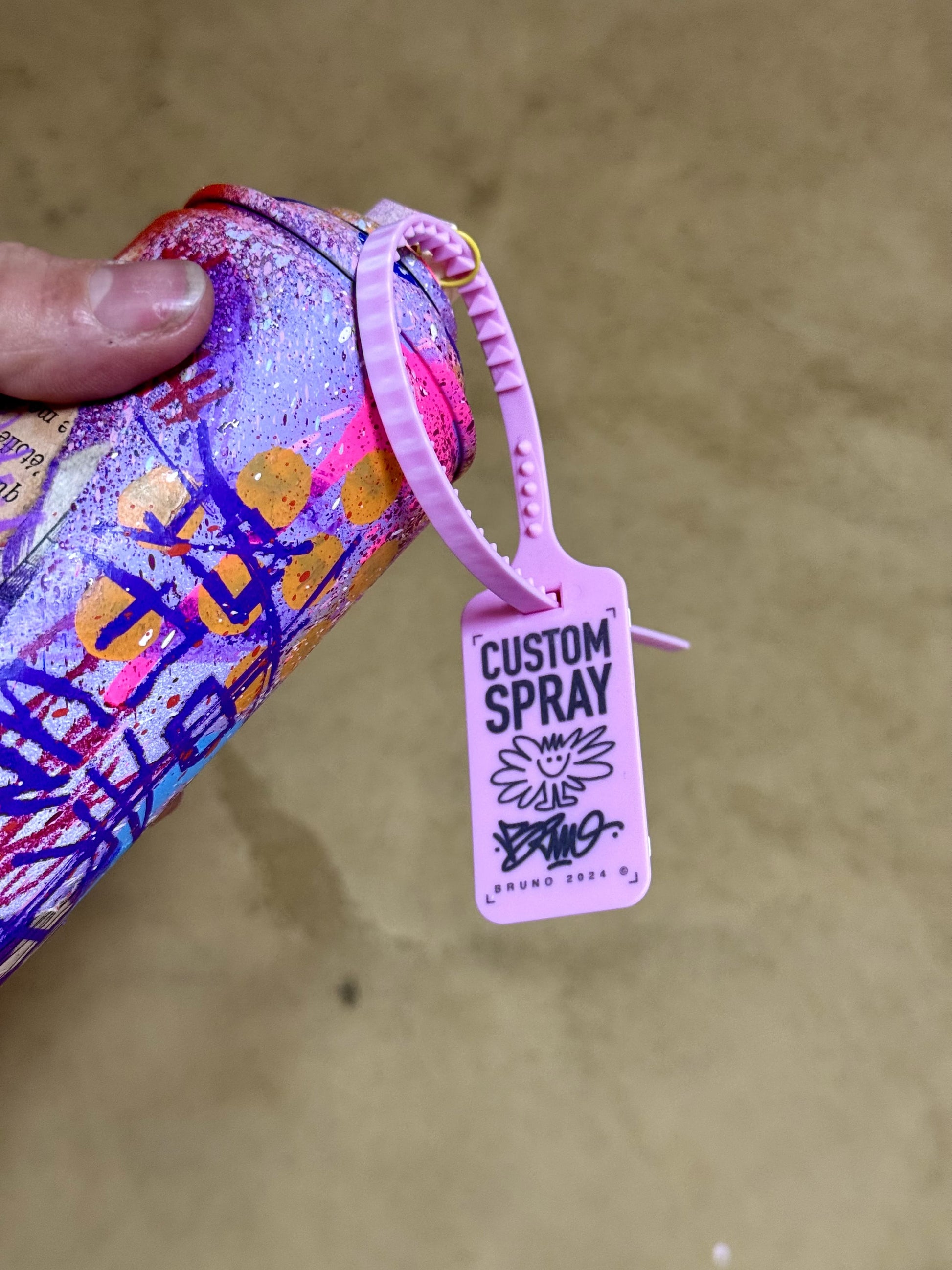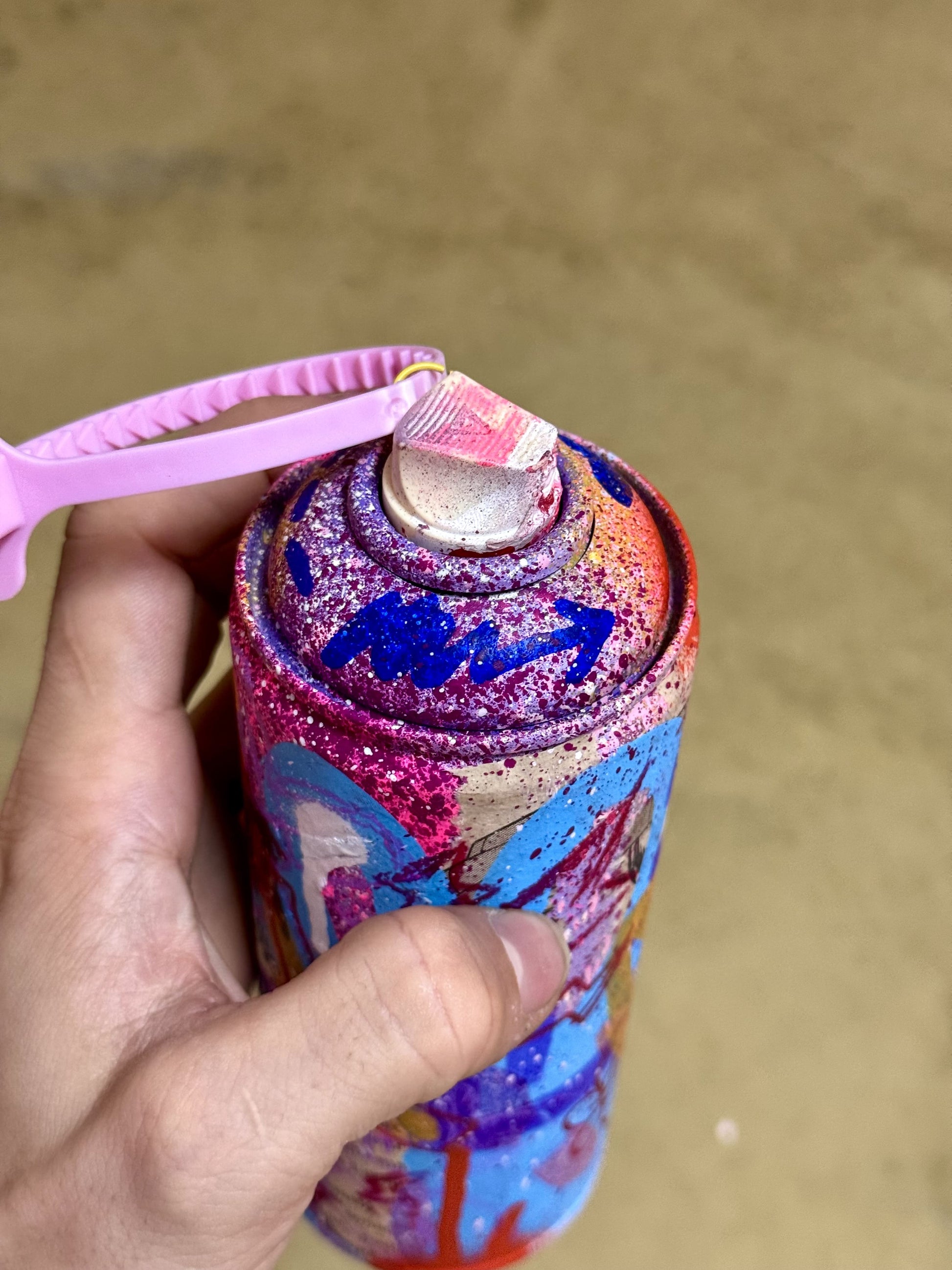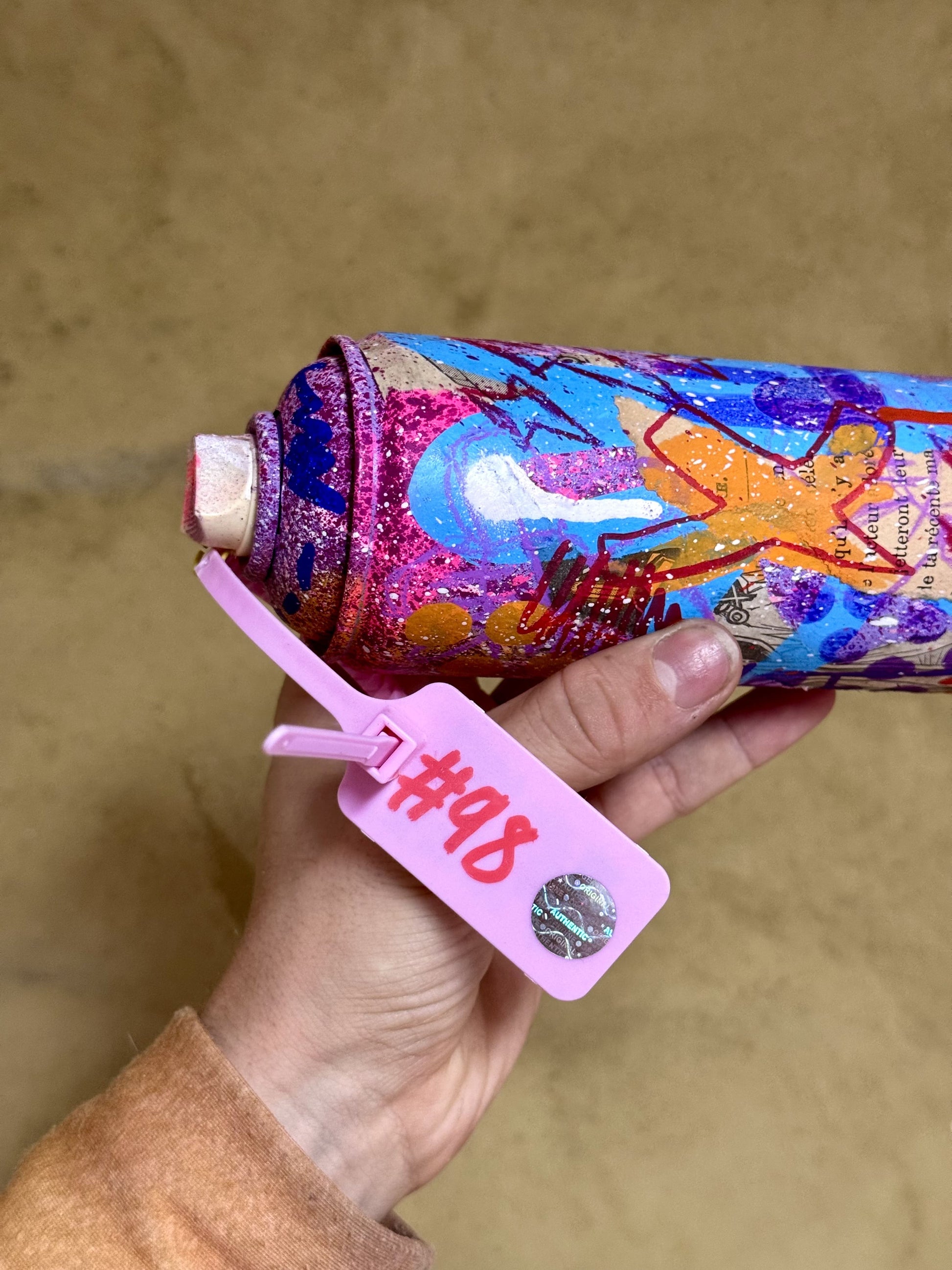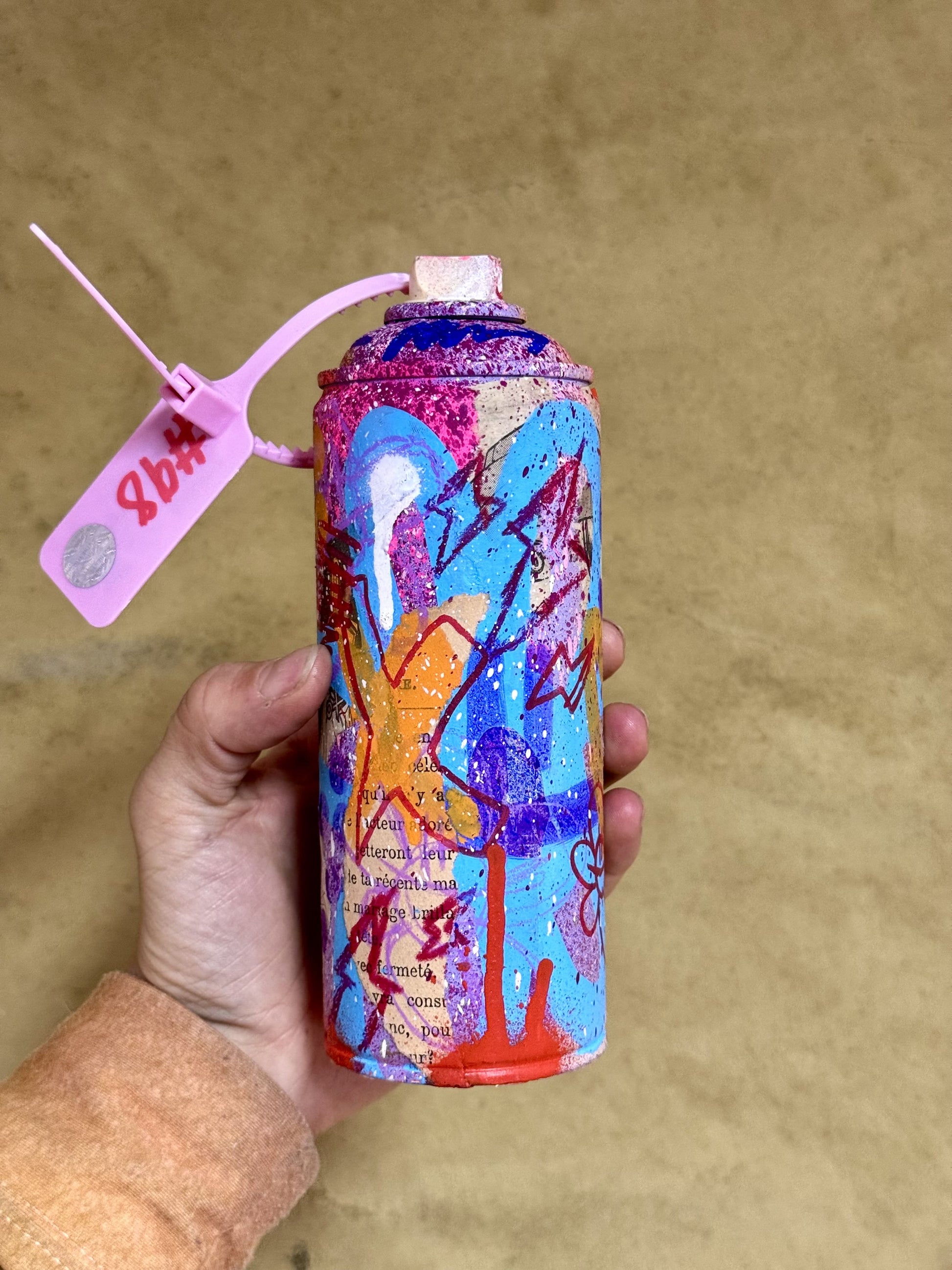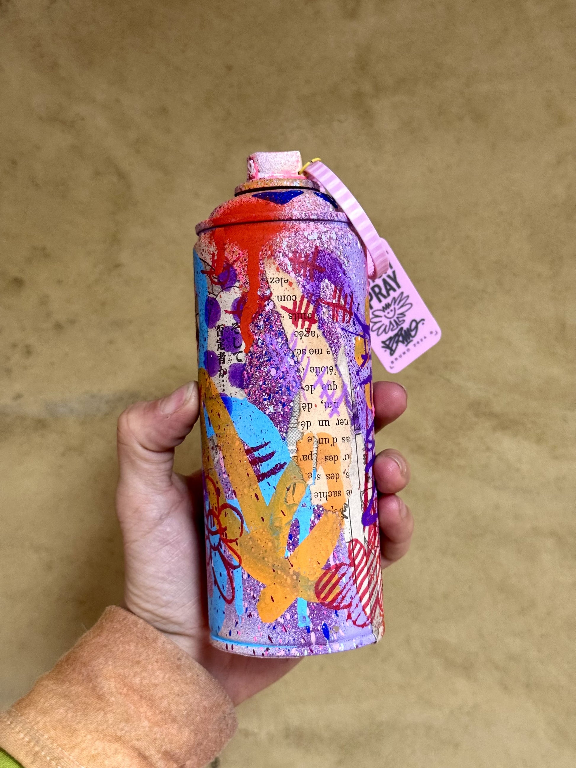Bombe de peinture vide recyclée et custom en collaboration avec l'artiste TutoDraw. Signée à la main sur la spray avec une preuve d'authenticité sur une carte signée à la main fixée sur la buse en plastique sur le dessus.